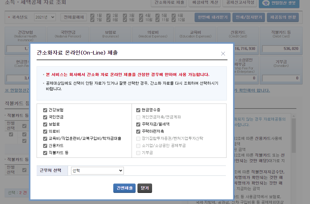상단에 나와 있는 설명과 같이 내가 다니고 있는 회사에서 간소화 자료 온라인 제출 서비스를 신청해야 이용 가능!