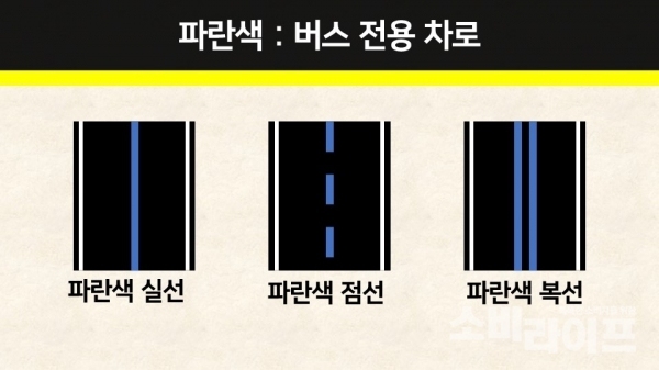 일반적인 파란색 선은 버스전용차로를 의미한다. 가로변 전용 차로와 중앙 버스 전용 차로로 나뉜다.